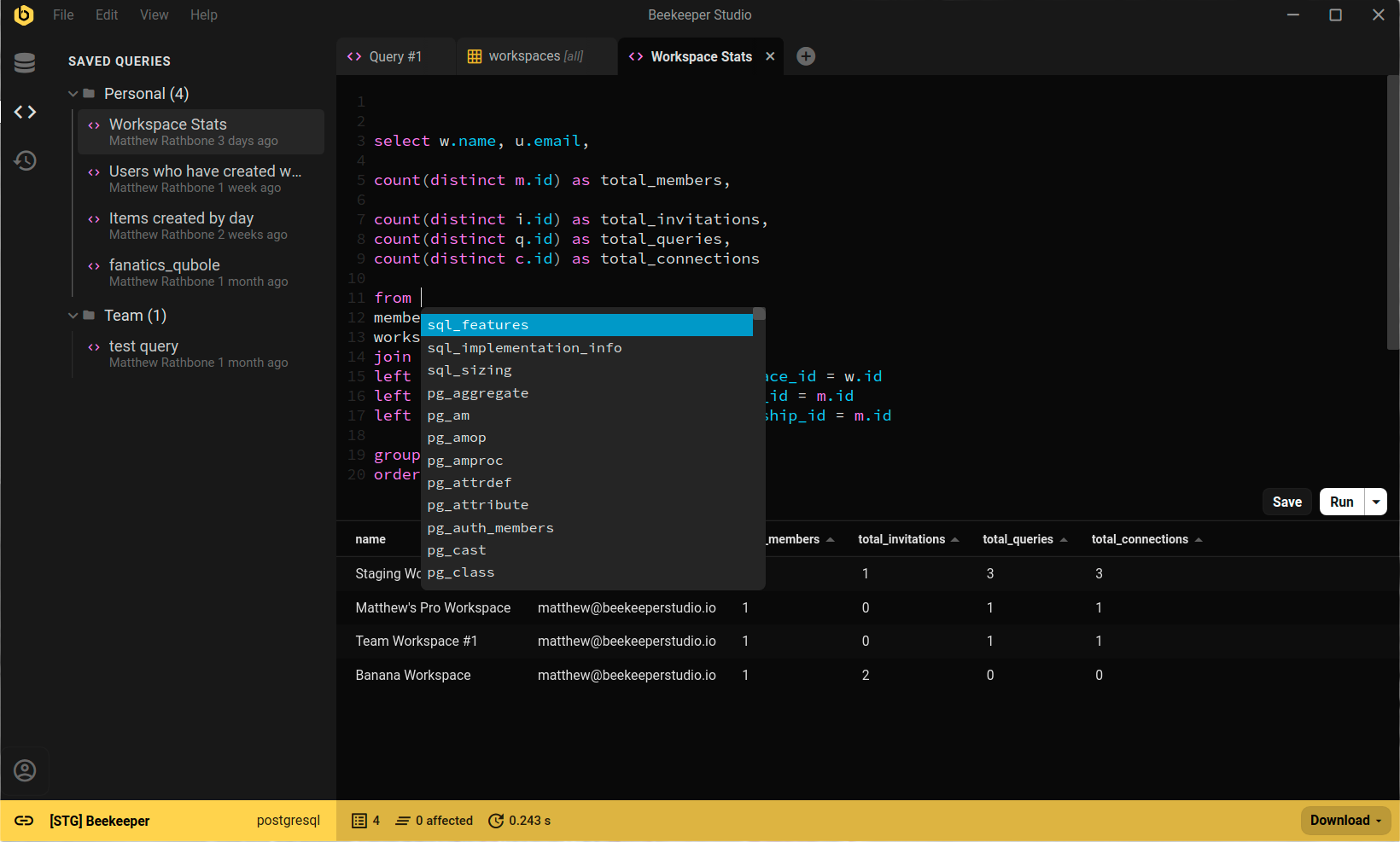 Whether you're looking to quickly and easily edit data, write SQL like a pro, create & modify tables, or even share queries with coworkers, Beekeeper Studio has you covered.